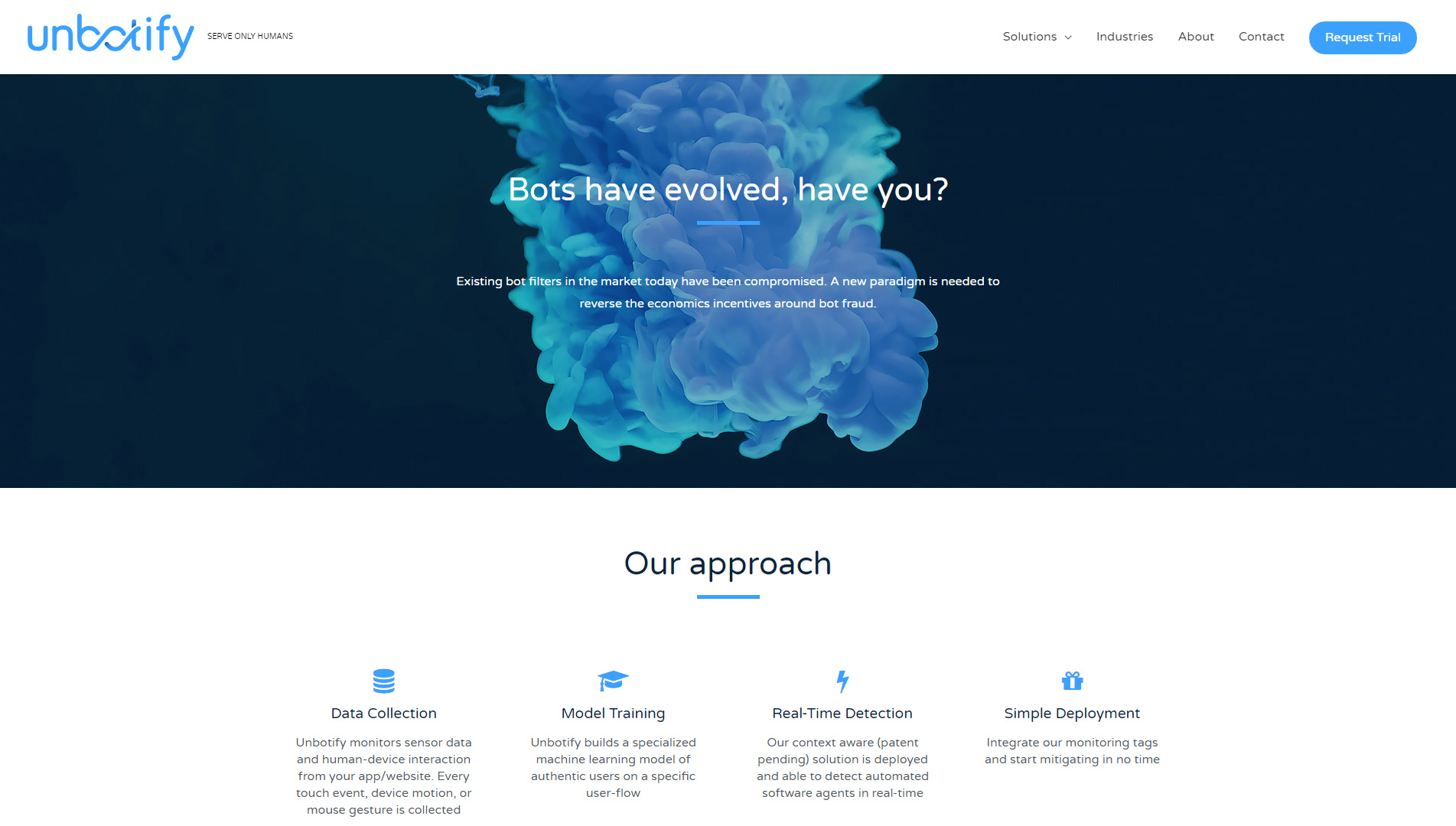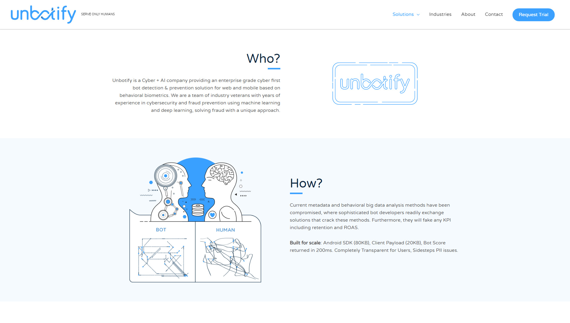 Unbotify providing an enterprise grade cyber first bot detection and prevention solution for web and mobile, using machine learning and based on behavioral biometric analysis.